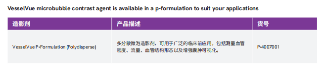超声造影是一种使用微泡造影剂来改善血液回声的技术,从而增强和帮助大血管和组织血管的可视化。Revvity的VesselVue微泡造影剂是脂质封装的微米级颗粒,具有气体核心,可静脉注射到动物体内。该试剂对动物无害,每个微泡都比红细胞还小,可在全身循环并在几分钟内清除体内。