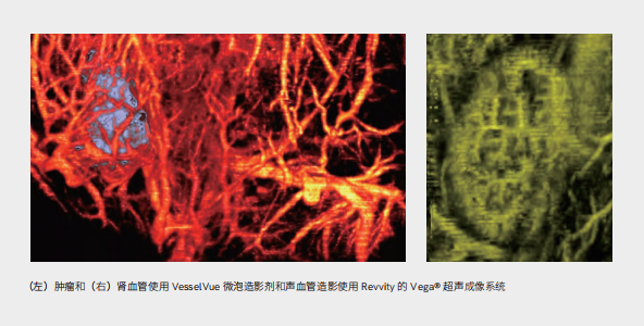 VesselVue微泡剂与具有对比增强成像模式的超声系统(例如Revvity Vega系统上的声学血管造影)一起使用时,可以对肿瘤和器官中的微脉管系统进行高灵敏度成像,用于评估血管生成或探索治疗反应或组织损伤随时间的变化。