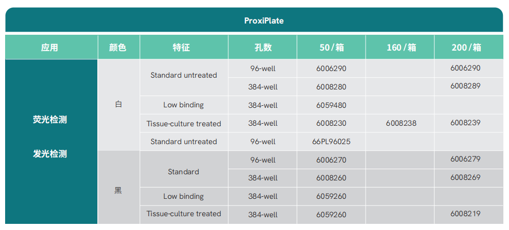 ProxiPlate浅孔微孔板设计符合SBS标准规格,可使微孔板与检测器探头的距离更接近,从而使检测效率大为提高。适宜5-20ul/孔微量化,同时能达到降低试剂消耗节约成本的目的。