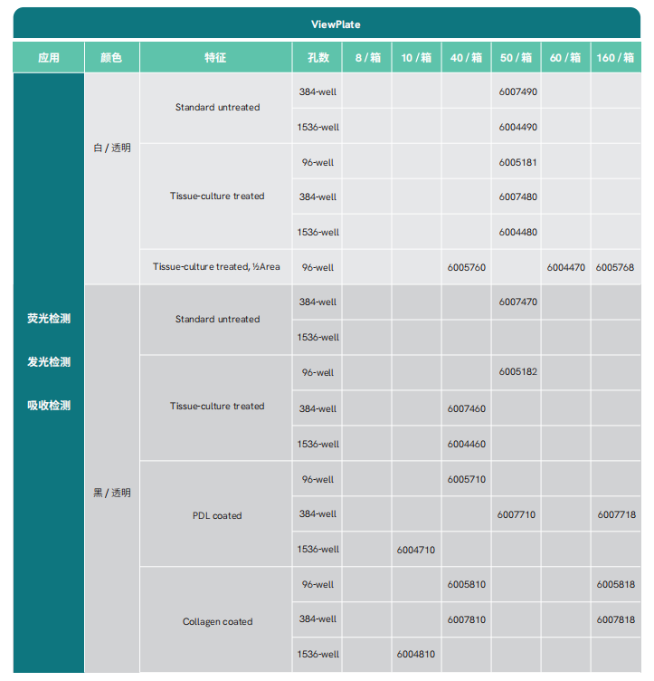 ViewPlate是为底读检测或显微成像系统而设计的微孔板,可应用于瑞孚迪Opera Phenix,Operetta CLS,也能适用于带有底读检测功能酶标仪或显微成像仪器。可广泛应用于活细胞成像或底读检测,及基于细胞培养的荧光和发光实验。
